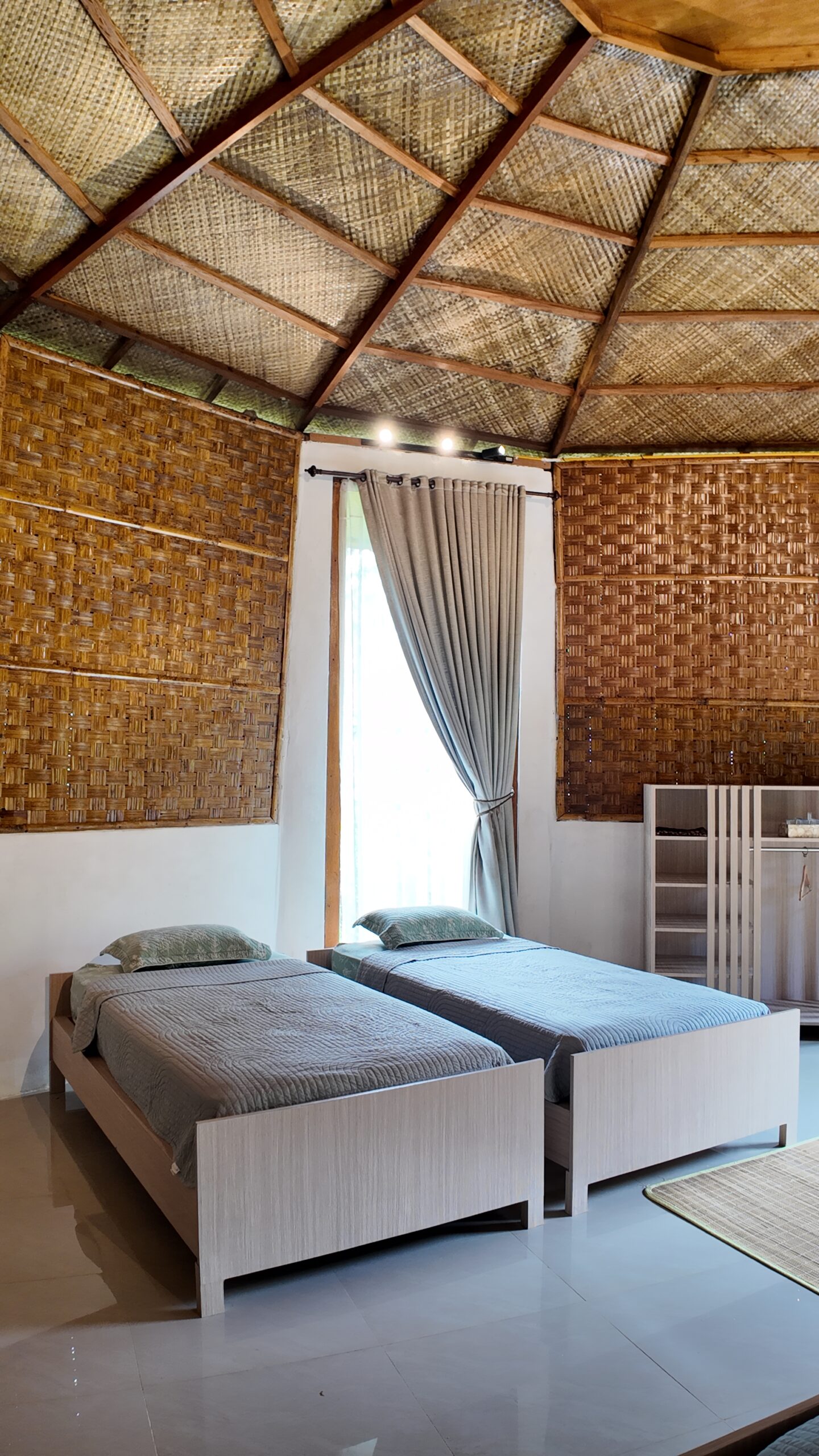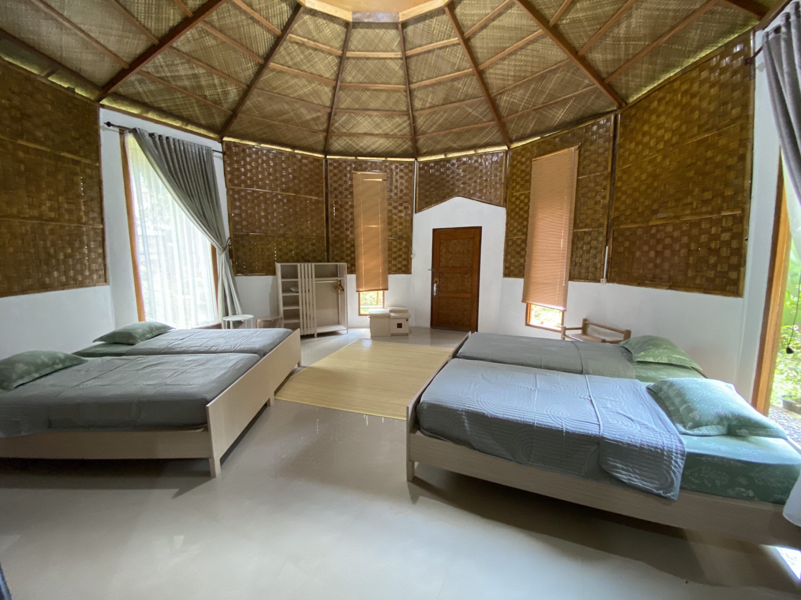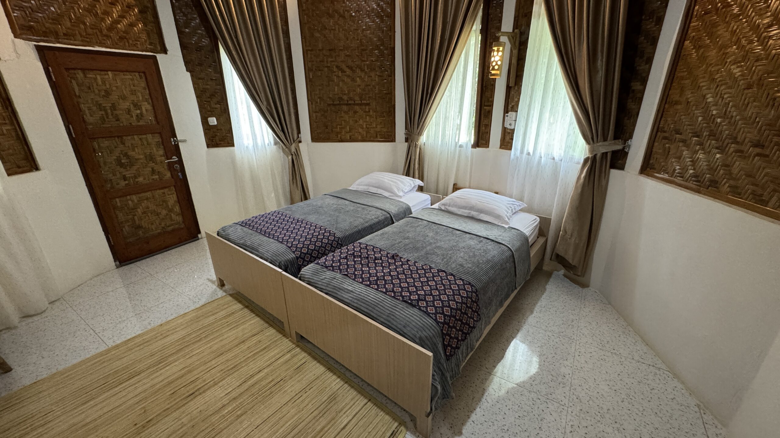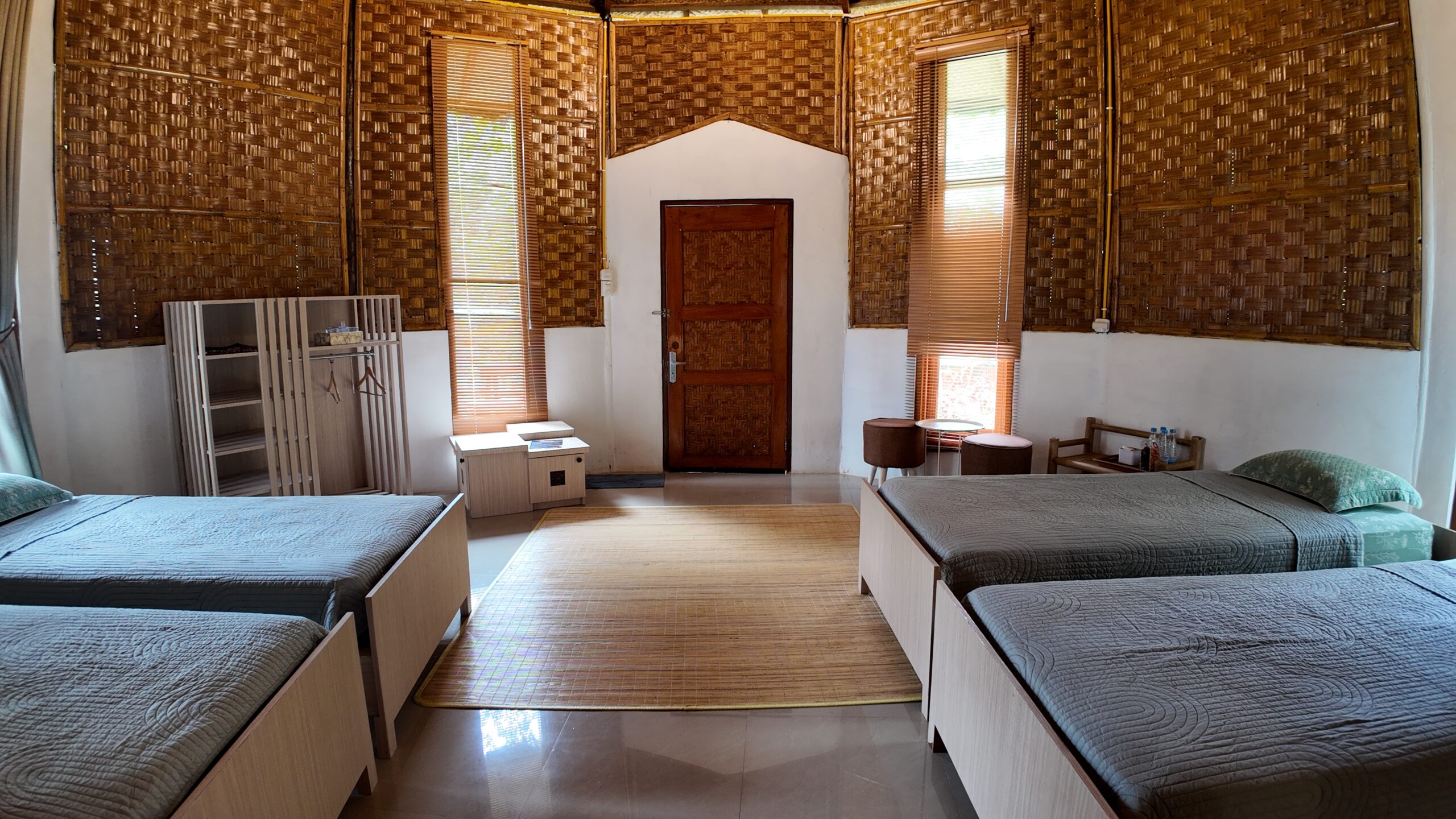 Kapasitas 4 orang dewasa, 4 breakfast, 4 single bed, AC, 2 bathroom, shower, water heater, closet duduk, mineral water, teh, kopi
