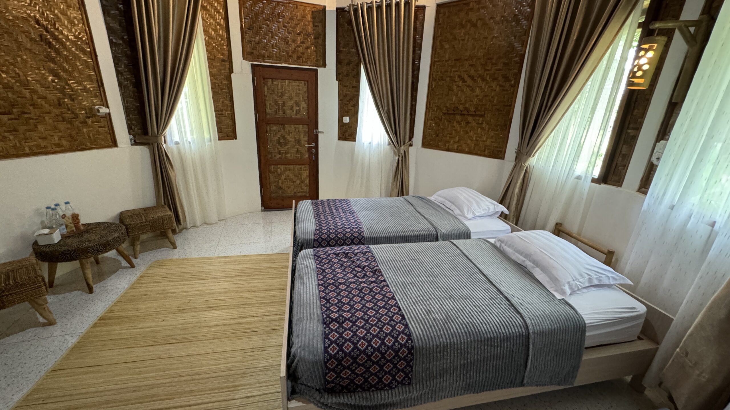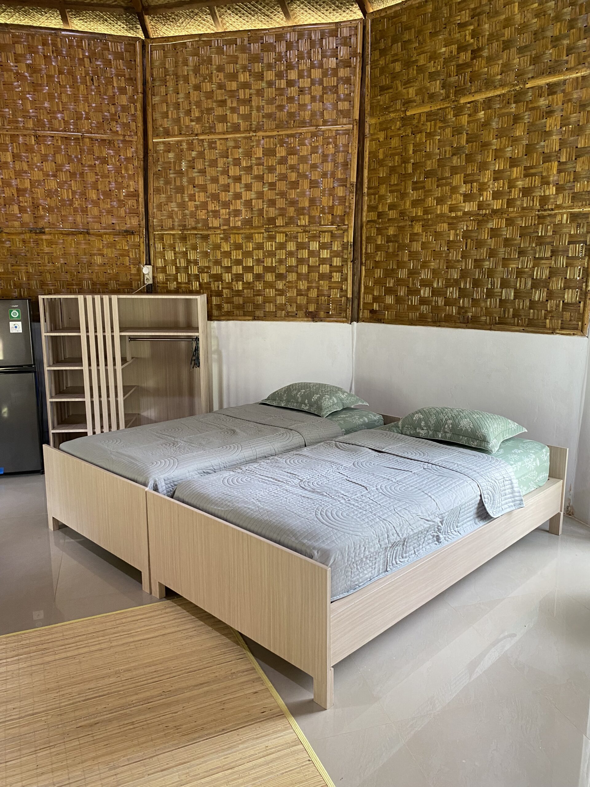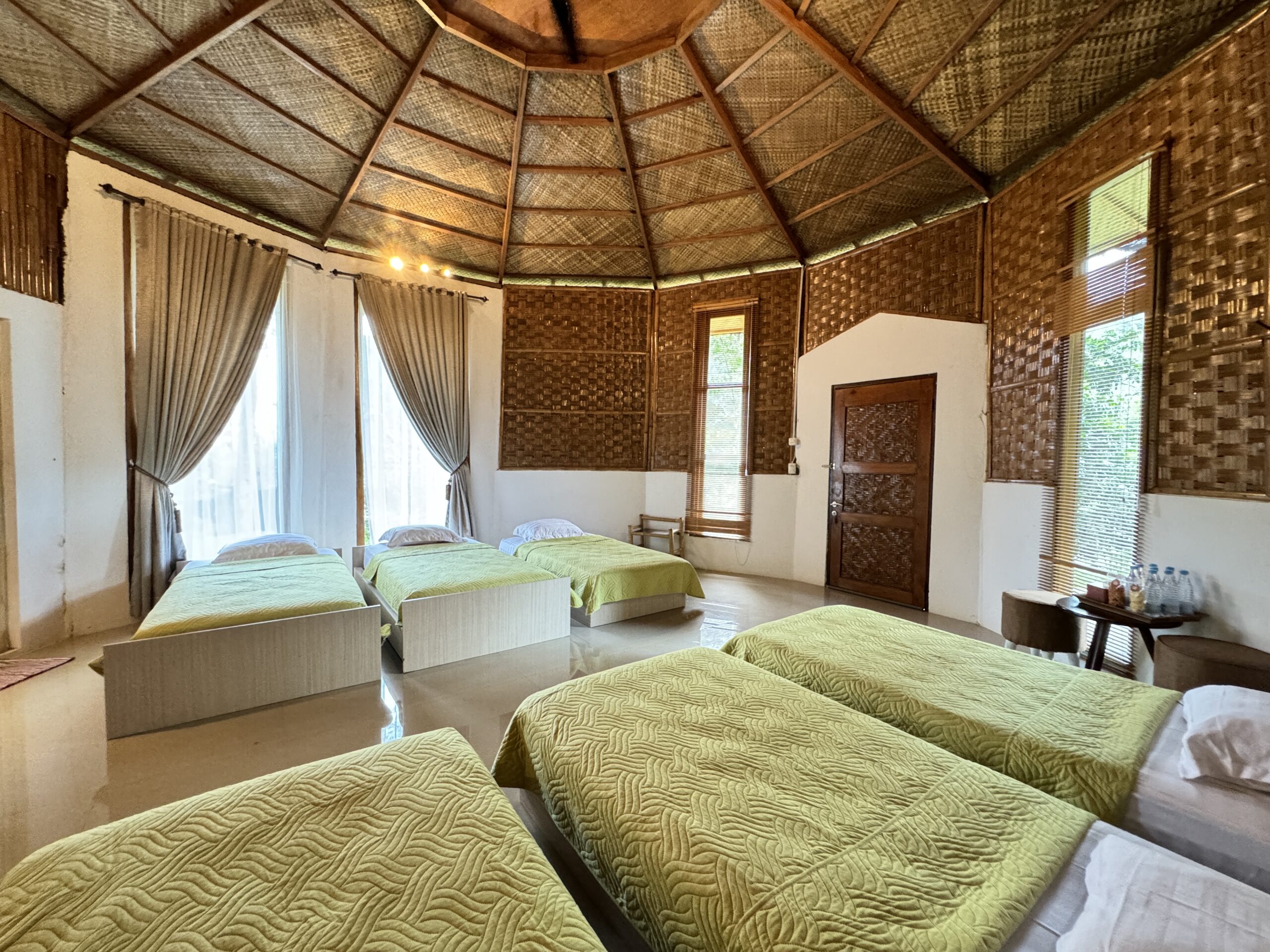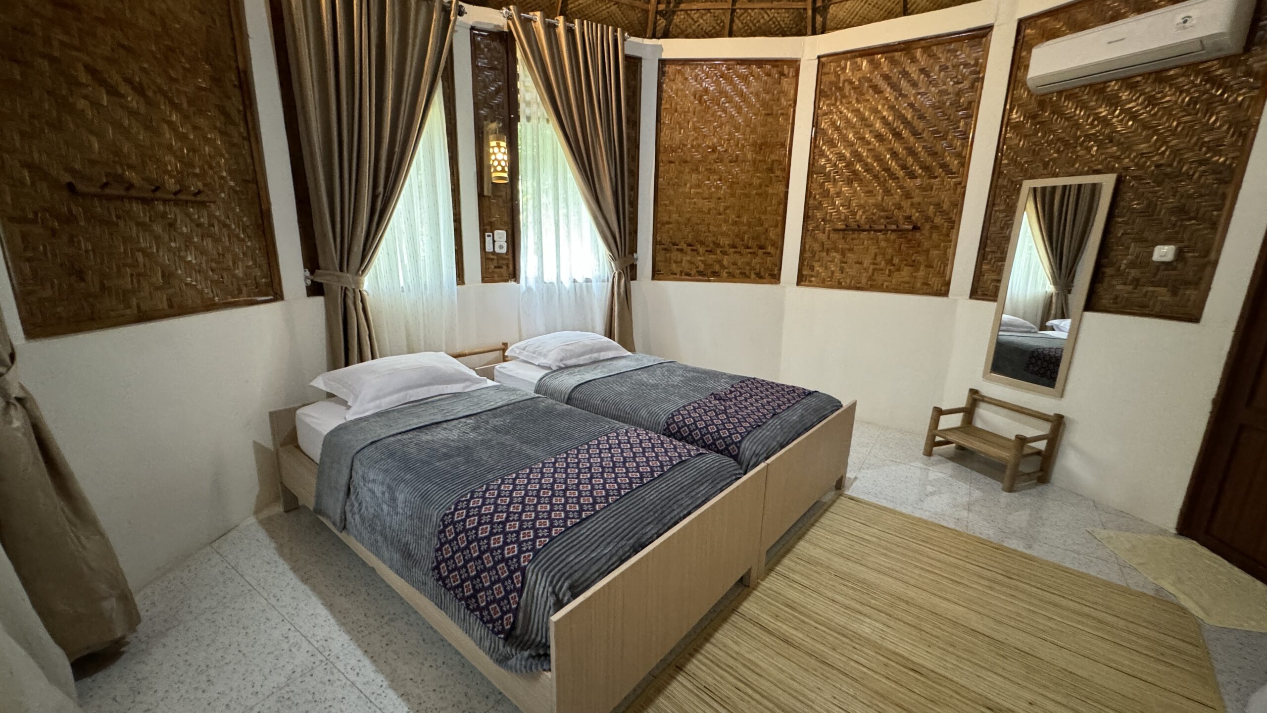 Kapasitas 4 orang dewasa, 4 breakfast, 4 single bed, AC, 2 bathroom, shower, water heater, closet duduk, mineral water, teh, kopi