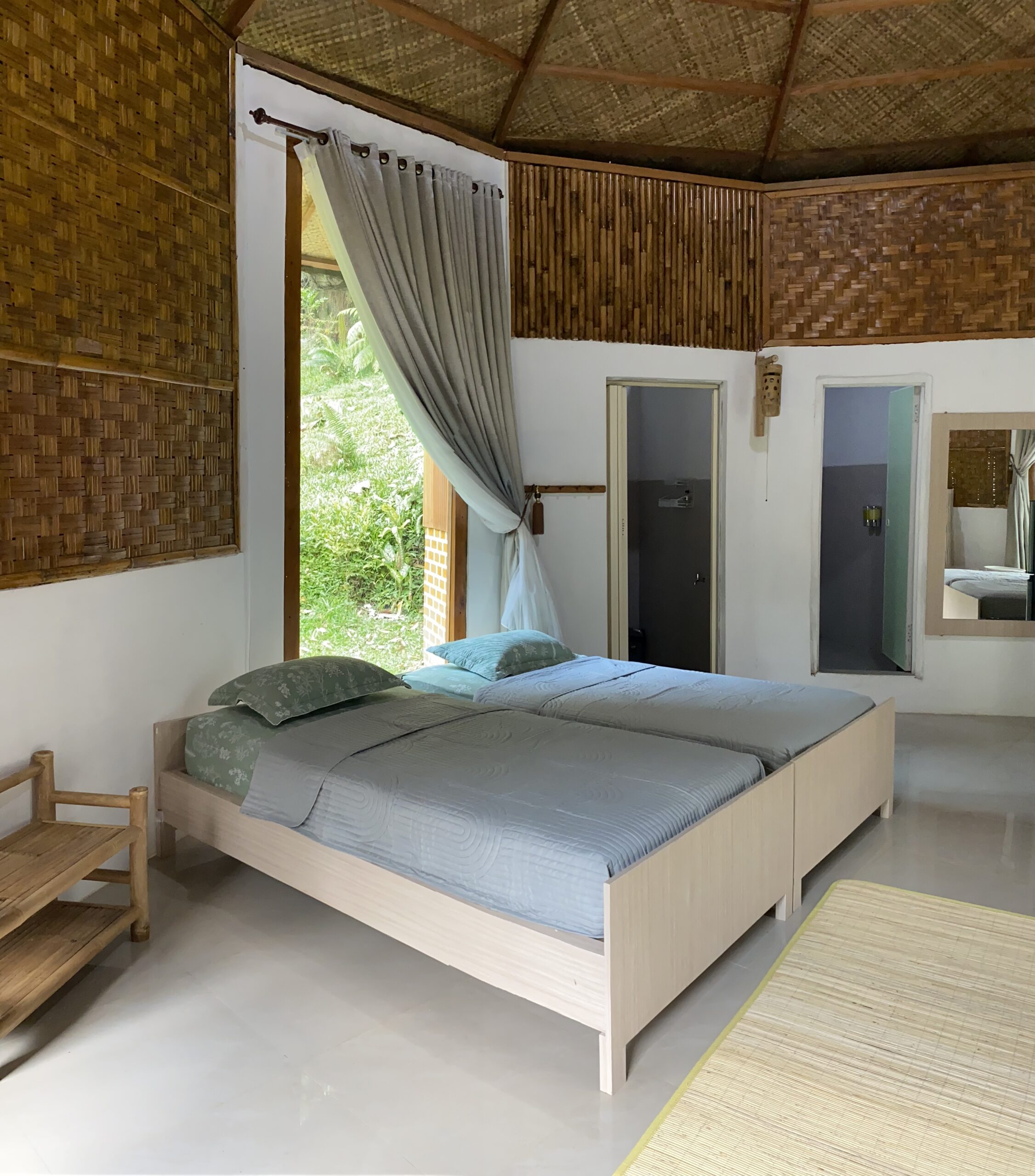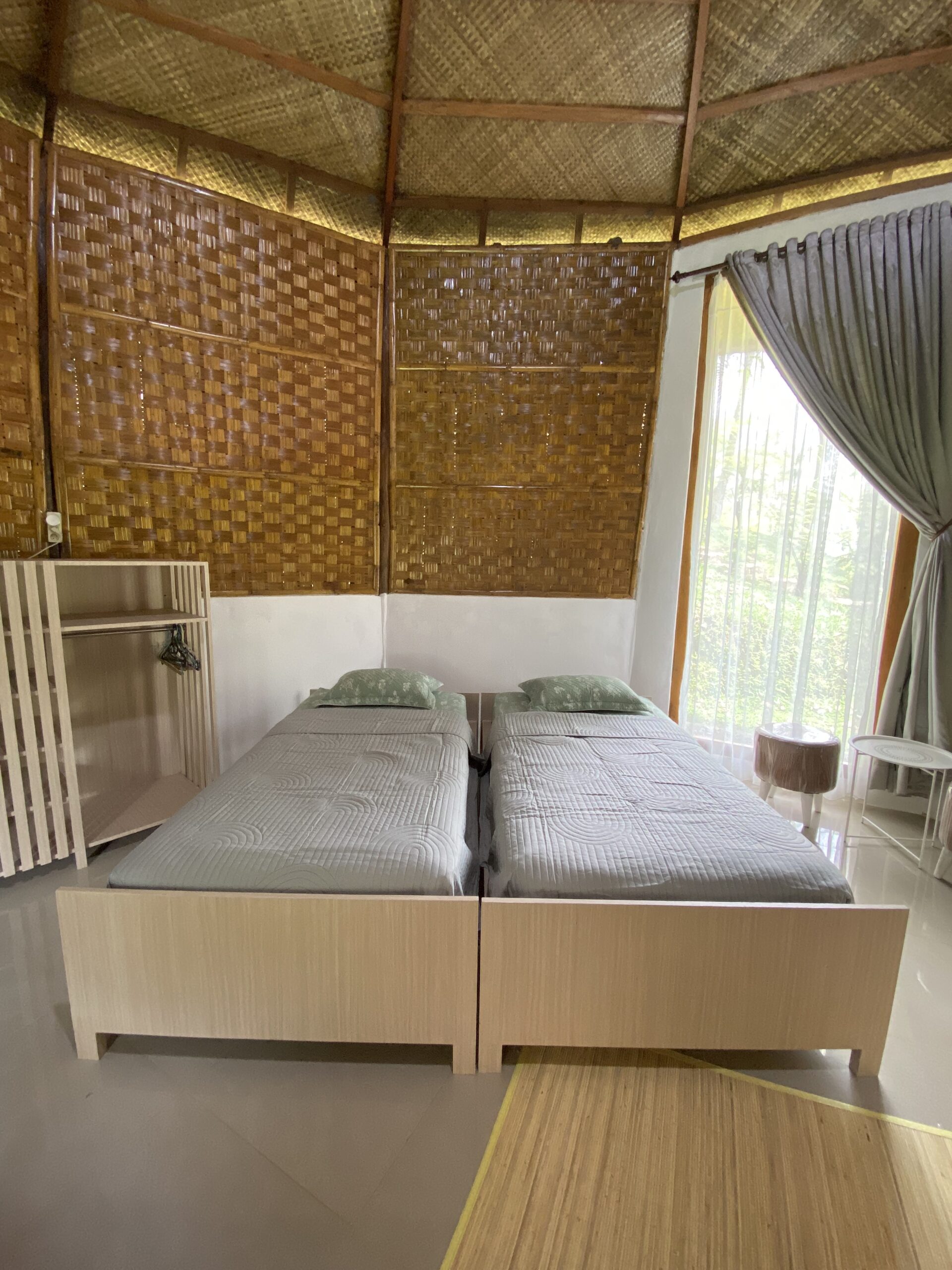 Kapasitas 2 orang dewasa, 2 breakfast, twin bed, AC, bathroom, shower, water heater, closet duduk, mineral water, teh, kopi